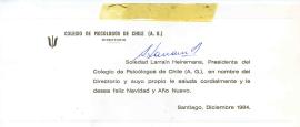 Tarjeta de navidad del Colegio de Psicólogos de Chile donde se lee "Soledad Larraín Heiremans, Presidenta del Colegio de Psicólogos de Chile (A.G.) en nombre del directorio y suyo propio le saluda cordialmente y le desea feliz navidad y año nuevo". Santiago, Diciembre de 1984