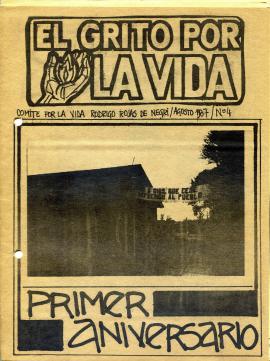 Boletín Nº 4 “El grupo por la vida”. Editado por Comité por la vida Rodrigo Rojas De Negri. Informa sobre el primer aniversario de la muerte de Rodrigo Rojas De Negri.