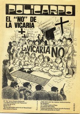 Revista S/N “Policarpo”. Editado por la Vicaria de la Solidaridad. Informa sobre la Iglesia después del plebiscito, el conflicto en la Vicaria de la Solidaridad.