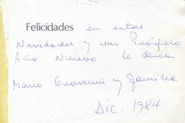 Tarjeta de saludo de navidad donde se desea saludo de felicidad y un próspero año nuevo. Mario Giovenini y familia. Diciembre de 1984.