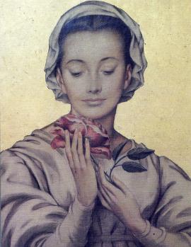 Tarjeta de navidad donde se observa el cuadro "La Virgen de la Rosa" de Manuel Huidobro. En su interior se lee un saludo de navidad de Patricia Rodríguez de DIMACOFI.