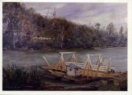Tarjeta de Navidad donde se observa una pintura, en la parte posterior se indica "Río Palena". En su interior se lee "Feliz Navidad y Próspero Año Nuevo". Juan Ignacio Pinto,Gerente, Imprenta Editorial Interamericana Ltda.